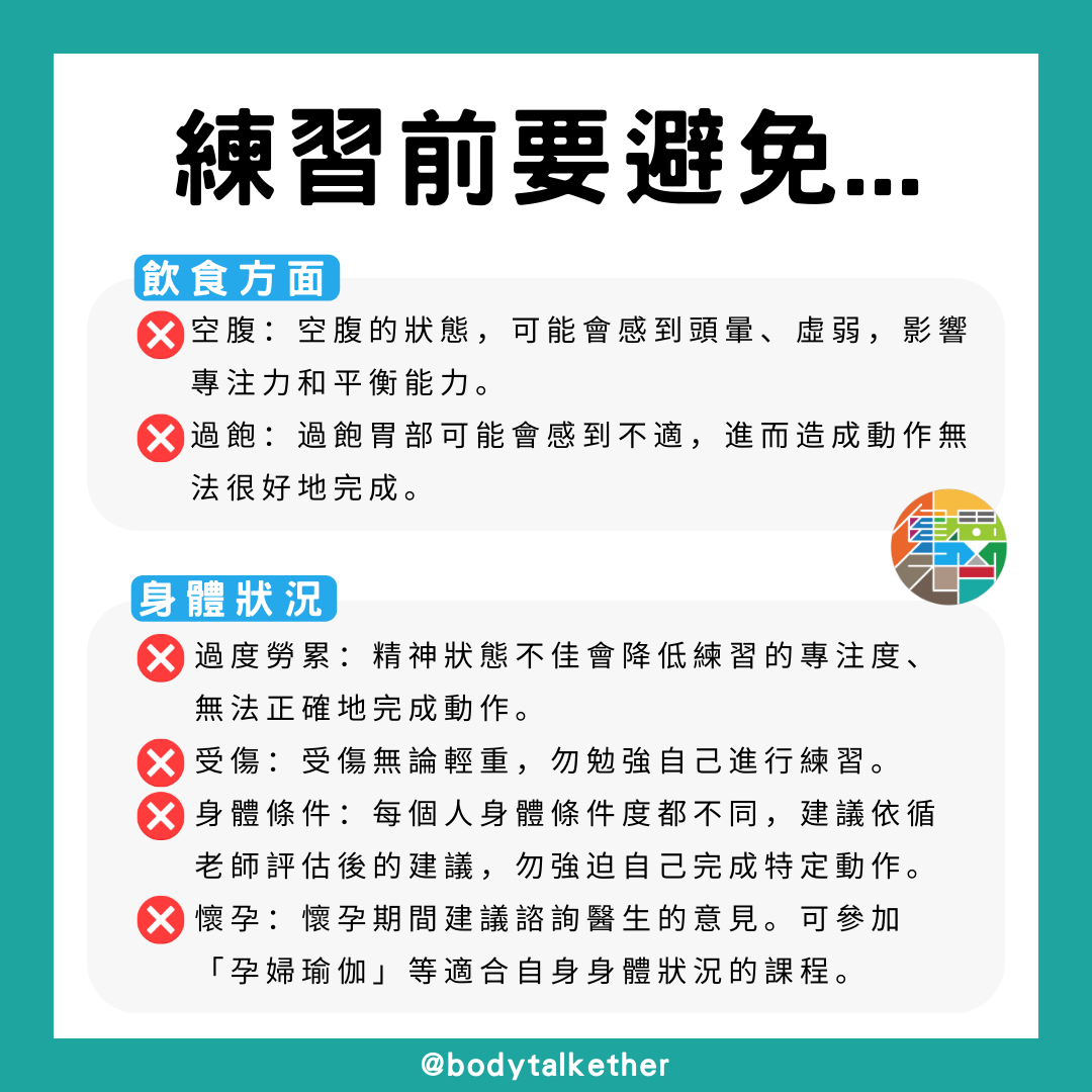 身體條件不符:每個人的身體條件和柔軟度都不同,經老師評估後,建議依循老師的建議,避免強迫自己進行某些特定的動作。