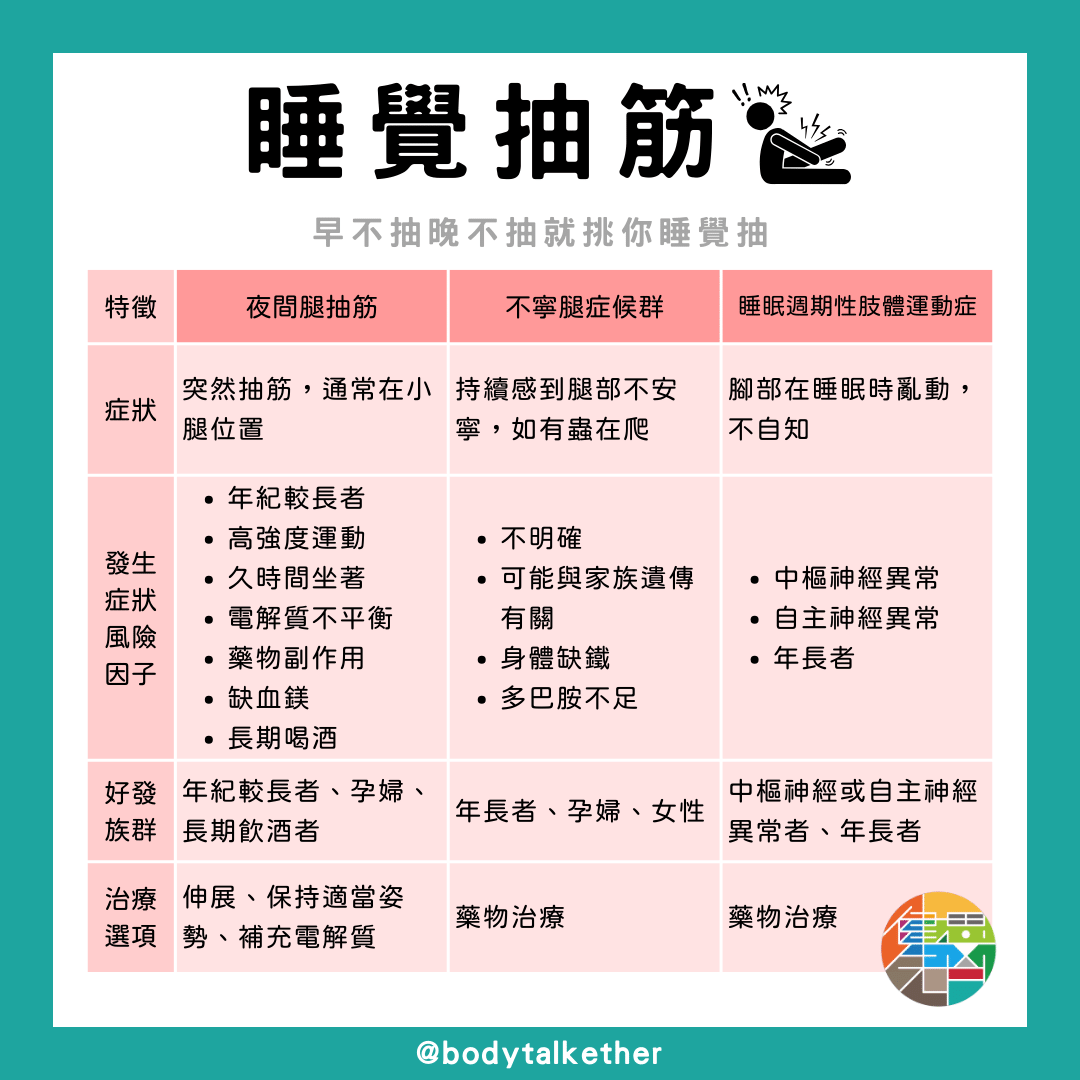 ✅ #夜間腿抽筋:睡覺期間突然抽筋,常發生在小腿位置。