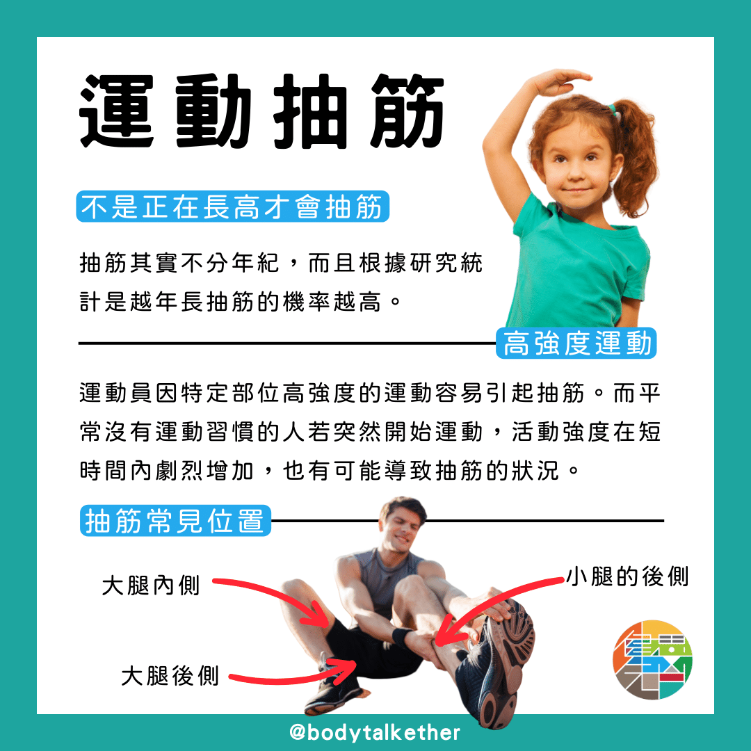 同時,運動量大的運動員因特定部位高強度的運動容易引起抽筋。而平常沒有運動習慣的人若突然開始運動,活動強度在短時間內劇烈增加,也有可能導致抽筋的狀況。