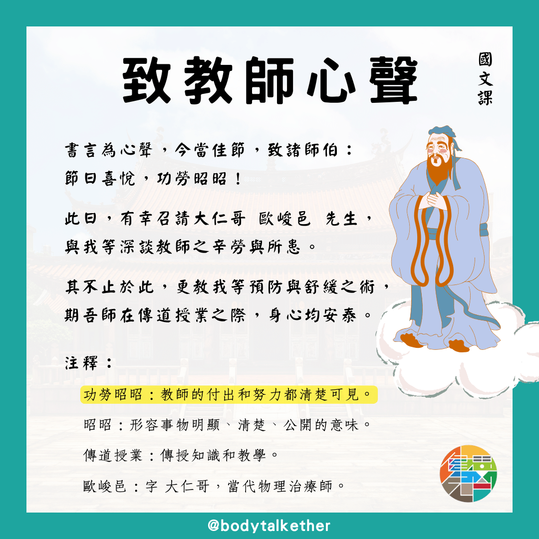 今天剛好是教師節,讓我們特別邀請大仁哥歐峻邑院長來和大家一起探討老師們在工作中常見的身體不適問題,以及如何有效緩解這些問題,更重要的是提供一些預防的觀念,幫助自己能夠順利度過勞心勞力的上課日!