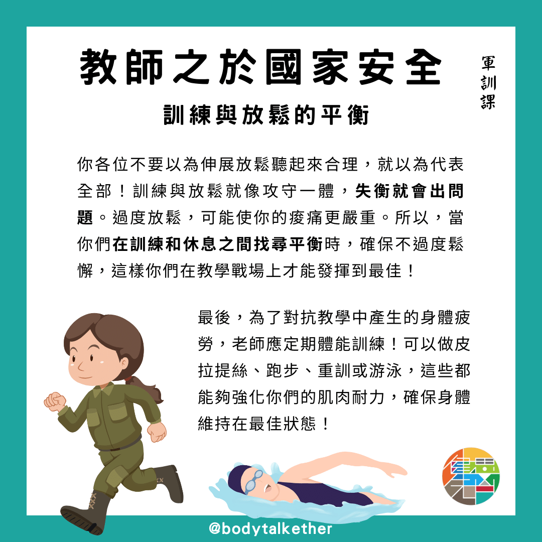 最後,我們要提醒大家注意過度放鬆的問題。訓練和放鬆需要保持平衡,過度放鬆可能會導致痠痛問題加重。因此,老師們在訓練和休息之間要保持良好的平衡,避免過度放鬆,這樣才能更好地應對工作中的身體不適。