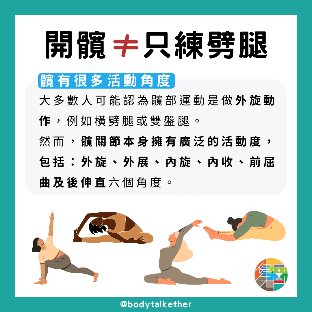 說到開髖,大多數人的第一印象可能是髖部的外旋動作,例如橫劈腿或雙盤腿。然而,開髖遠不止這些。髖關節本身擁有廣泛的活動度,包括:外旋、外展、內旋、內收、前屈曲及後伸直這六個角度。