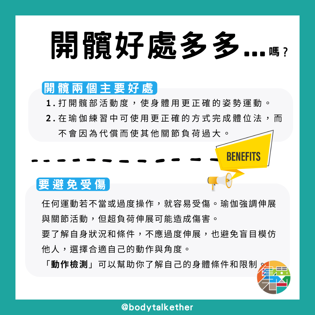 因此,練習瑜伽的 #自我覺察 很重要,你要自己了解在此時此刻自己的活動限制,並針對這些限制做出相對應的處理和訓練,這樣就會大大降低練習瑜伽的受傷風險。
