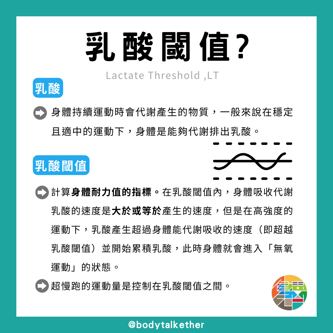 乳酸是身體持續運動時會代謝產生的物質,一般來說在穩定且適中的運動下,身體是能夠代謝排出乳酸。而乳酸閾值是計算身體耐力值的指標,簡單來說,在乳酸閾值內,身體吸收代謝乳酸的速度是大於或等於產生的速度,但是在高強度的運動下,乳酸產生超過身體能代謝吸收的速度(即超越乳酸閾值)並開始累積乳酸,此時身體就會進入「無氧運動」的狀態。