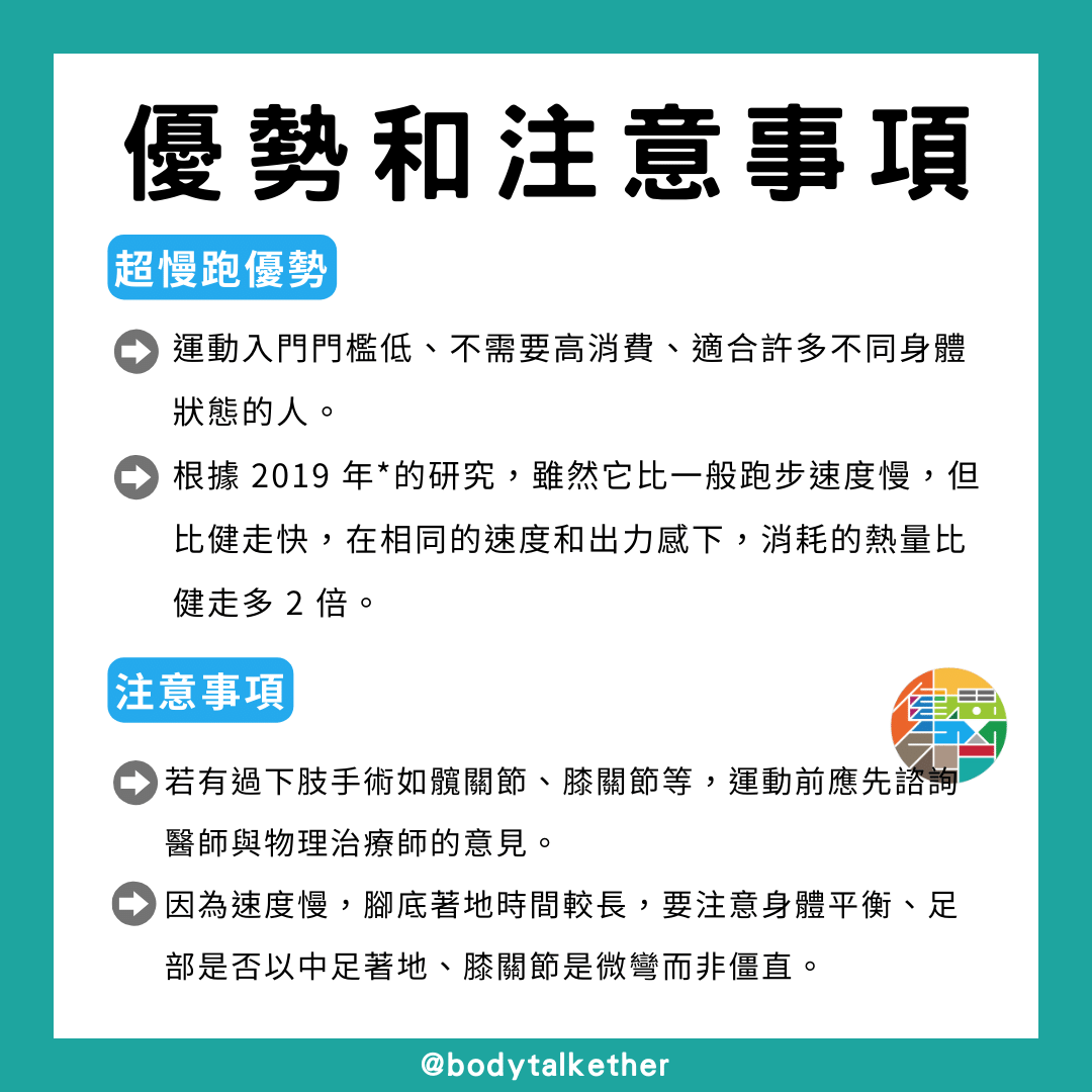 根據前述的描述,超慢跑的優點為:運動入門門檻低、不需要高消費、適合許多不同身體狀態的人。儘管如此,只要是運動就會有必須要注意的事項,而超慢跑要注意的是如果有進行過下肢手術如髖關節、膝關節等,運動前應先諮詢醫師與物理治療師的意見;又因為速度慢,腳底著地時間可能相對較長,要注意身體平衡的狀況、足部著地是否以中足為主、膝關節角度是微彎而非僵直,以免過度增加關節的壓力。