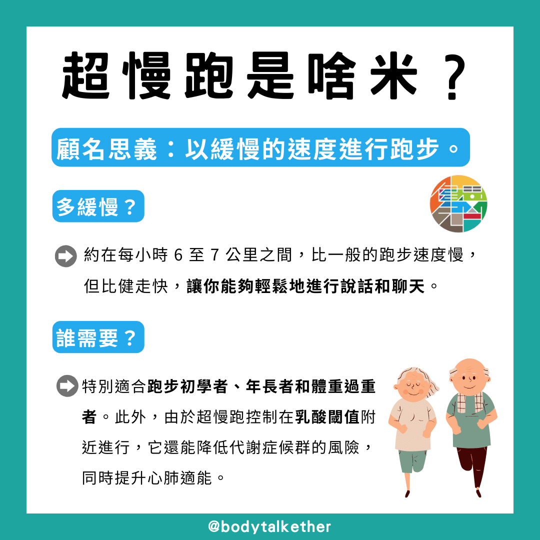 這種運動方式特別適合跑步初學者、年長者和體重過重者。此外,由於超慢跑控制在乳酸閾值附近進行,它還能降低代謝症候群的風險,同時提升心肺適能。