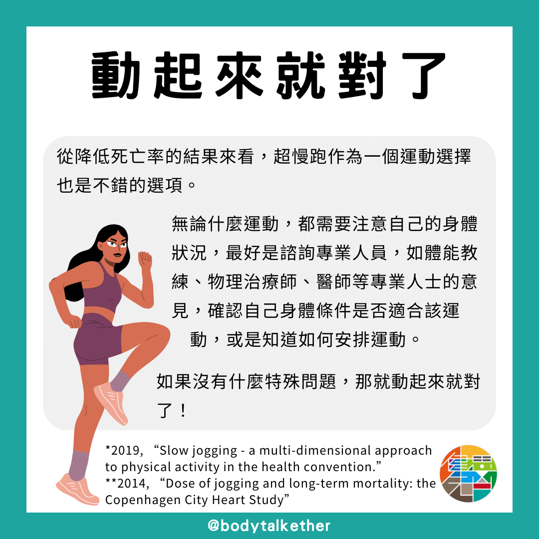 每個人對於運動各有所好,而從降低死亡率的結果來看,超慢跑作為一個運動選擇也是不錯的選項。但是,無論你選擇什麼樣的運動,都需要注意自己的身體狀況,最好是諮詢專業人員,如體能教練、物理治療師、醫師等專業人士的意見,看看自己的身體條件是否適合該項運動,或是要如何安排運動的進程。