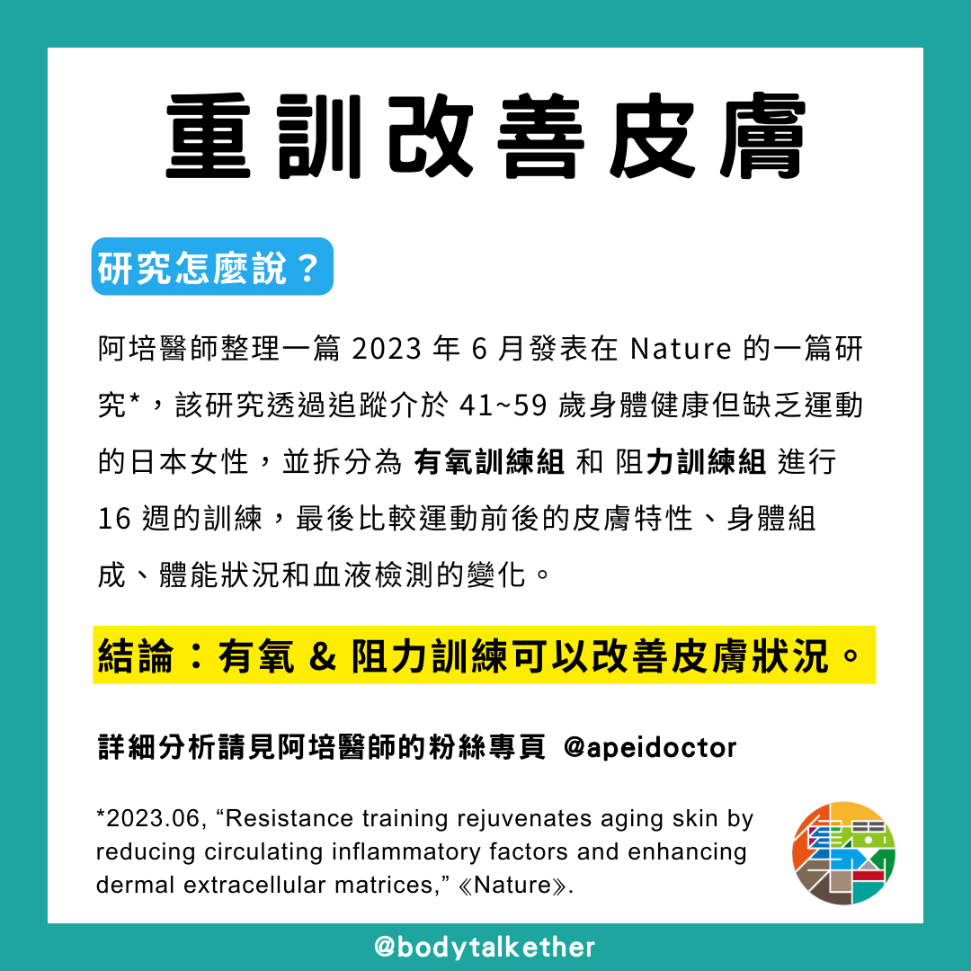 在阿培醫師個人的「阻力訓練可以改善皮膚老化?!」社群貼文中,幫大家整理了這項研究的重點。