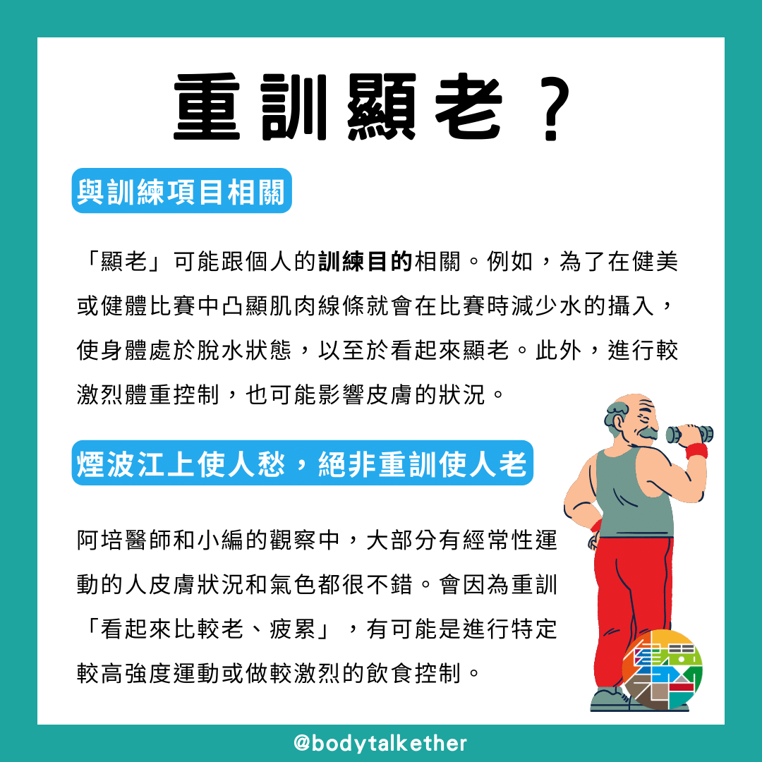 雖然煙波江上使人愁,但絕非重訓使人老,而可能是進行與特定目相關的劇烈飲食控制或高強度訓練,使得訓練者看起來可能比實際年齡大。