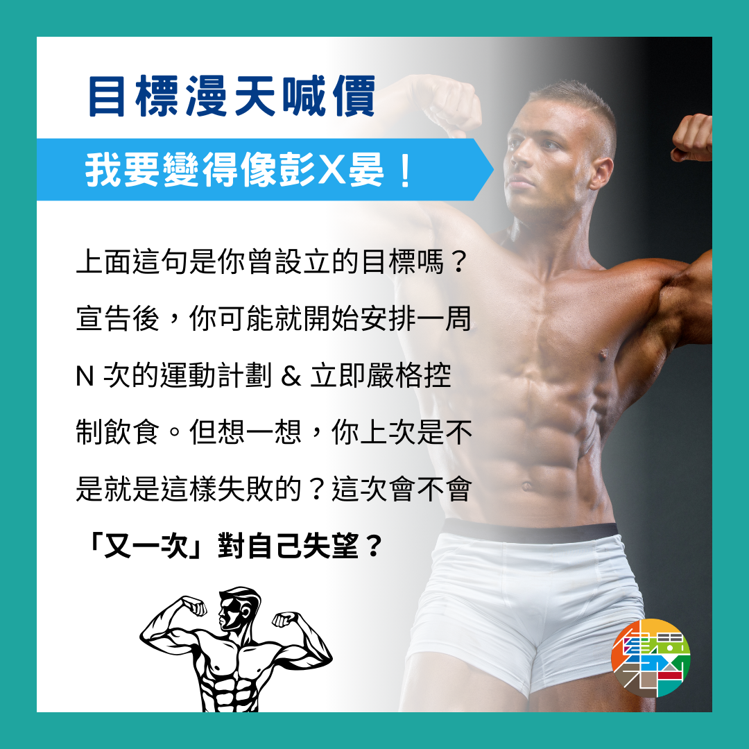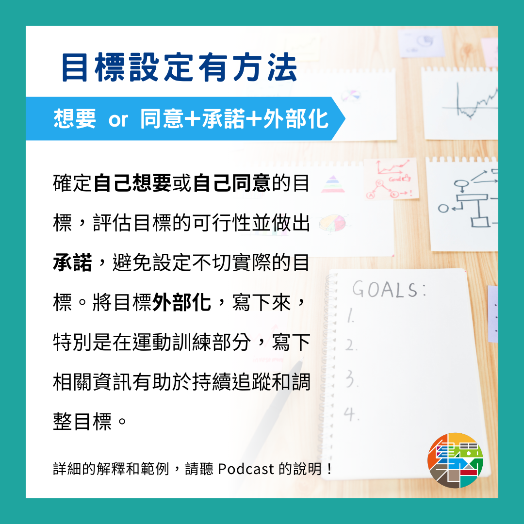 首先,確定目標是個 #自己想要 或 #自己同意。自己想要的目標大部分都是自內心的渴望,同時也是驅動行動的熱情來源。其次,評估目標的可行性並做出 #承諾,避免設定不切實際的目標。接著,將目標外部化,簡單來說就是「寫下來」!特別在運動訓練這個部分,要把能夠幫助完成目標的相關資訊寫下來,例如減多少脂肪、增肌多少肌肉、調整多少體重,有助於持續追蹤和調整。