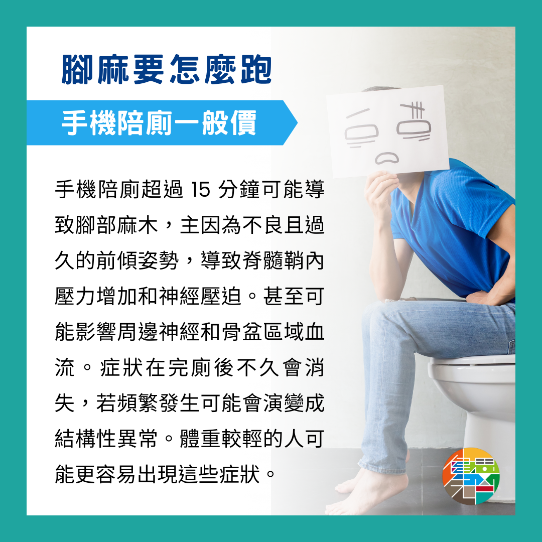通常症狀在完廁後不久後就會消失,但是你得先拖著你的腿離開廁所,並忍受那種麻麻的不適感!然而,若這類症狀頻繁發生,可能會逐漸演變成真正的結構性異常,這是需要注意的。