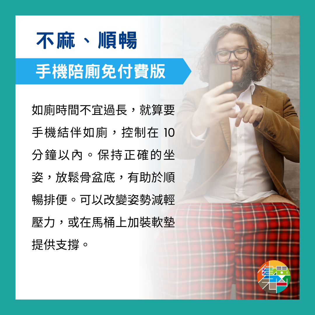 上廁所的時間不宜過長,就算要手機結伴如廁,時間長度盡量控制在 10 分鐘以內。其次,保持正確的坐姿,使骨盆底放鬆,有助於讓排便更加順暢。倘若因為 💩💩 不順暢可以試著每隔一小段時間改變姿勢來減輕壓力,或是可以考慮在馬桶上加裝軟墊,以提供更好的支撐。
