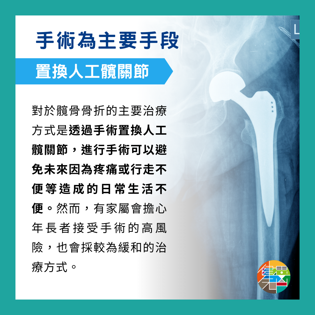 對於髖骨骨折的主要治療方式是透過手術置換人工髖關節,進行手術可以避免未來因為疼痛或行走不便等造成的日常生活不便。然而,有家屬會擔心年長者接受手術的高風險,也會採較為緩和的治療方式。