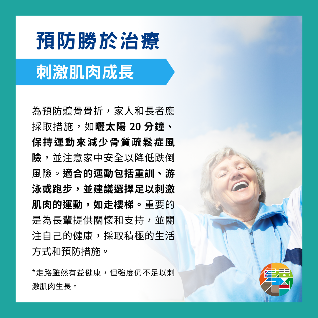 對於預防髖骨骨折,家人和長者本身都可以採取積極的措施。曬太陽(20 分鐘左右)和保持運動都有助於減少骨質疏鬆症的風險。此外,家人應當留意家中的安全,減少跌倒的風險。