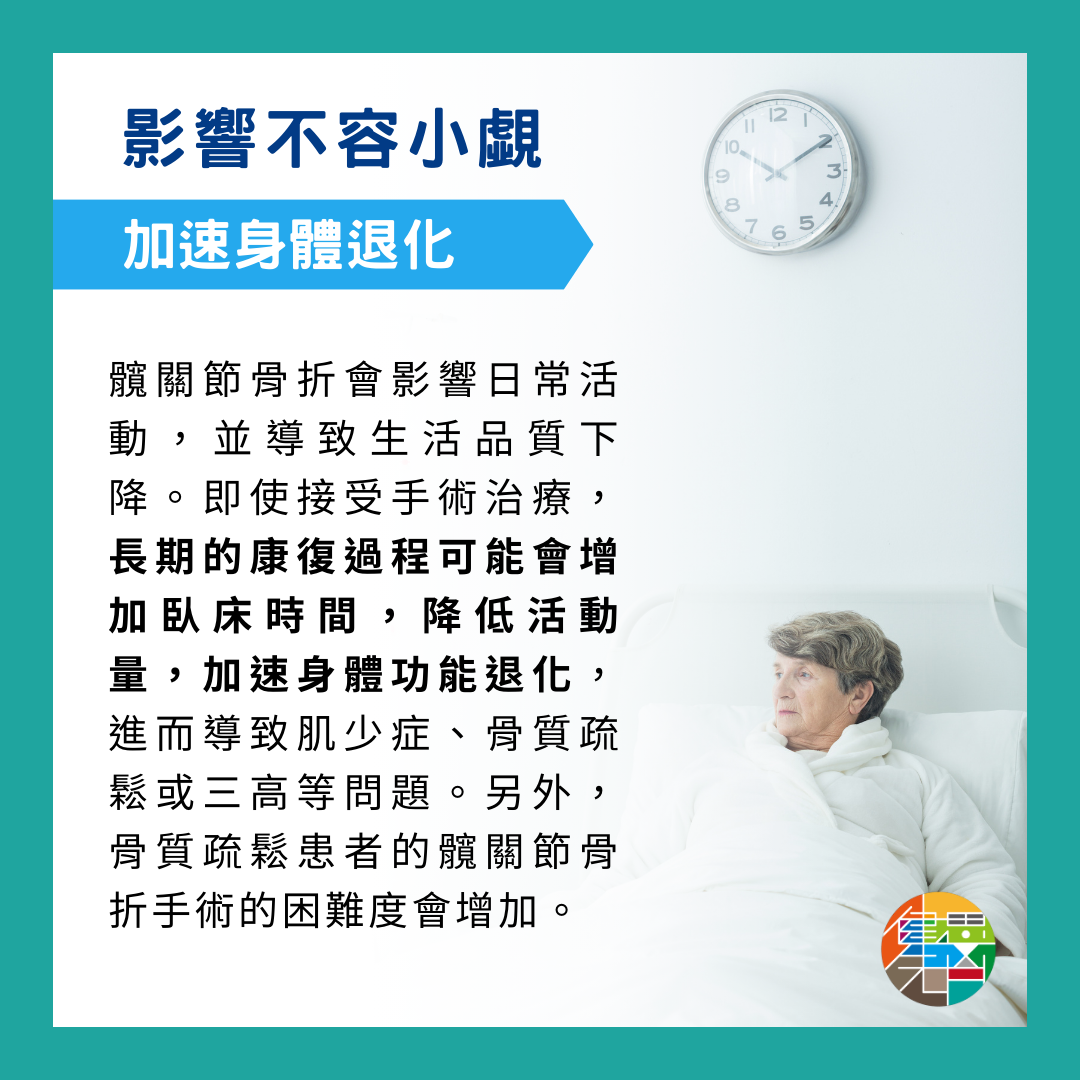所以我們要注意髖關節骨折的問題,它除了會影響日常的移動、造成生活品質的下降。即使透過開刀治療,後續長時間的恢復復健,容易使得臥床時間變長、活動量變少,導致身體功能退化加劇,甚至造成肌少症、骨質疏鬆或是三高等問題。此外,骨質疏鬆症的患者受傷後,也會增加髖關節骨折手術的困難度。