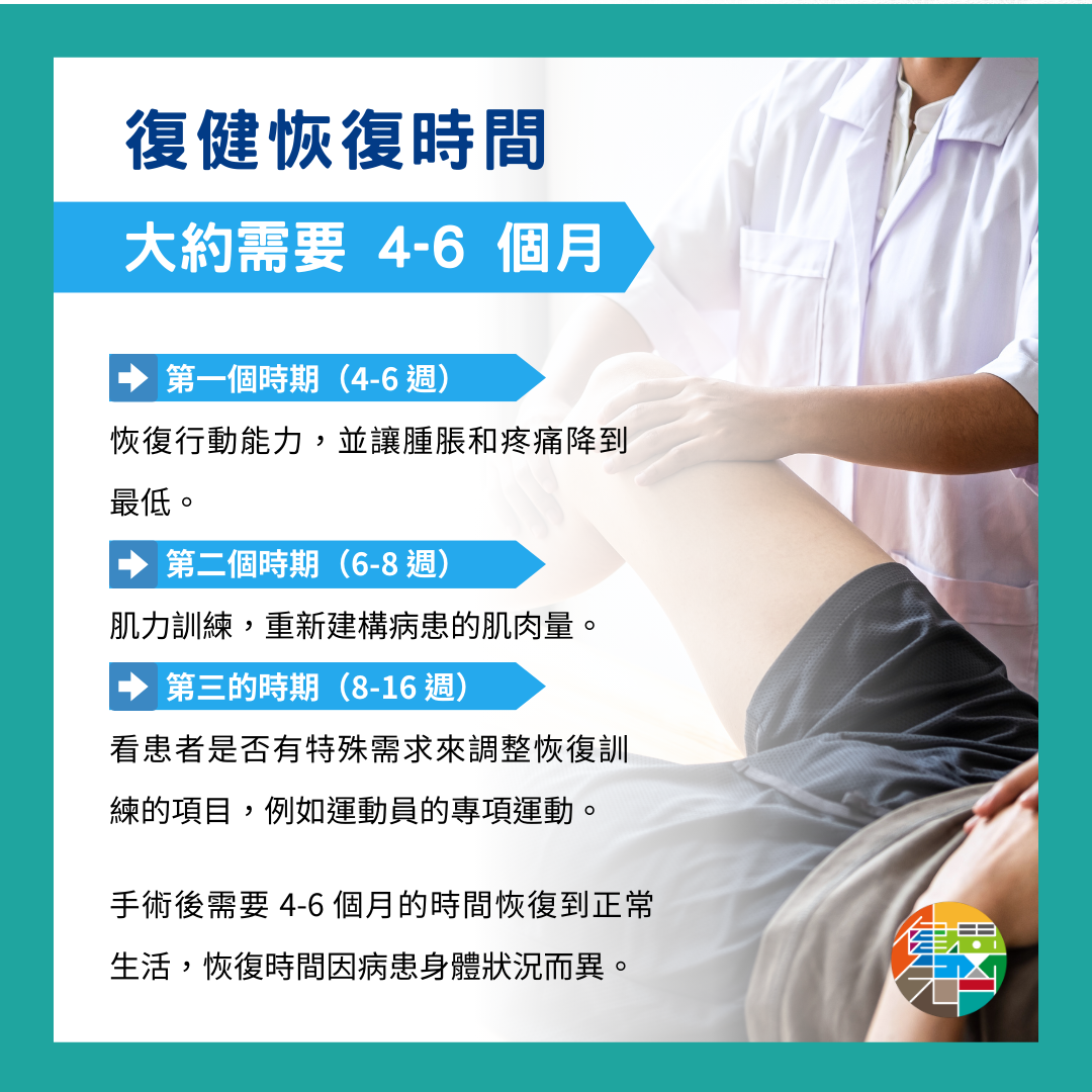 從手術後到恢復到正常生活大約需要 4-6 個月的時間。依據病患的身體狀況不同,身體恢復的復健時間長度也會有所不同。