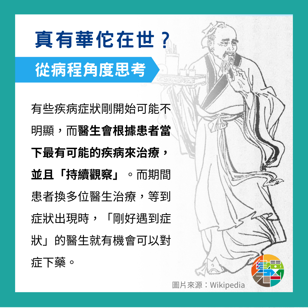 某個疾病的主要症狀並非一開始就很明顯,甚至是根本就還沒有出現。因此,醫生都是針對此刻病患最有可能的疾病做治療,並且「持續追蹤觀察」,而在症狀還沒有出現前,若病患同時求助於不同的醫師,「剛好」到症狀明顯出現的時候,神醫也就出現了,因為此時醫師就可以對症下藥。