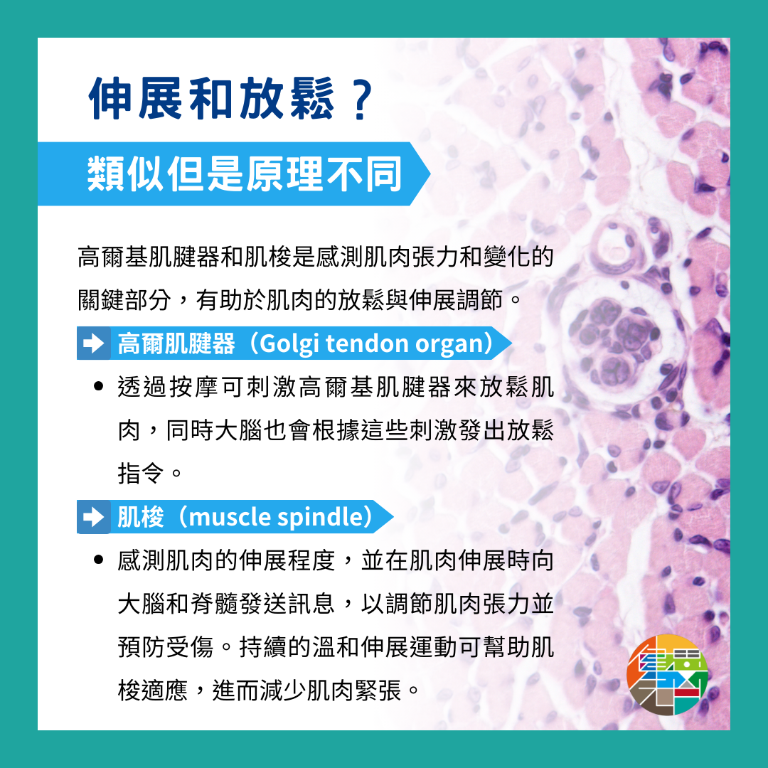 肌梭(muscle spindle):肌梭是肌肉內的感應器官,用來偵測肌肉的伸展程度。當肌肉伸展或收縮,肌梭向大腦和脊髓發送訊息,以便適當調節肌肉張力,防止受傷。若配合持續溫和的伸展運動,肌梭會適應這些伸展,幫助減少肌肉緊張。