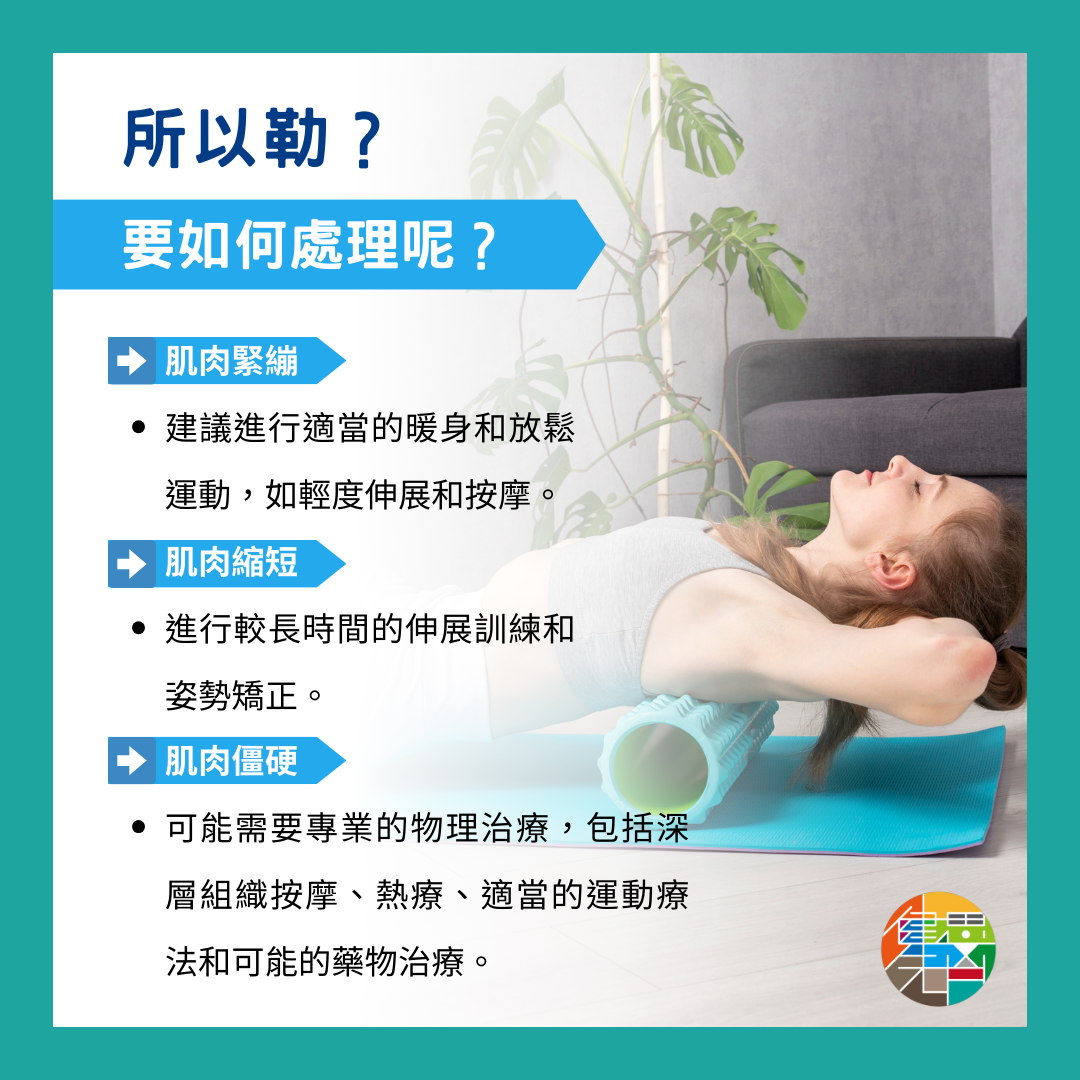 對於肌肉僵硬,可能需要專業的物理治療,包括深層組織按摩、適當的運動療法和可能的藥物治療。