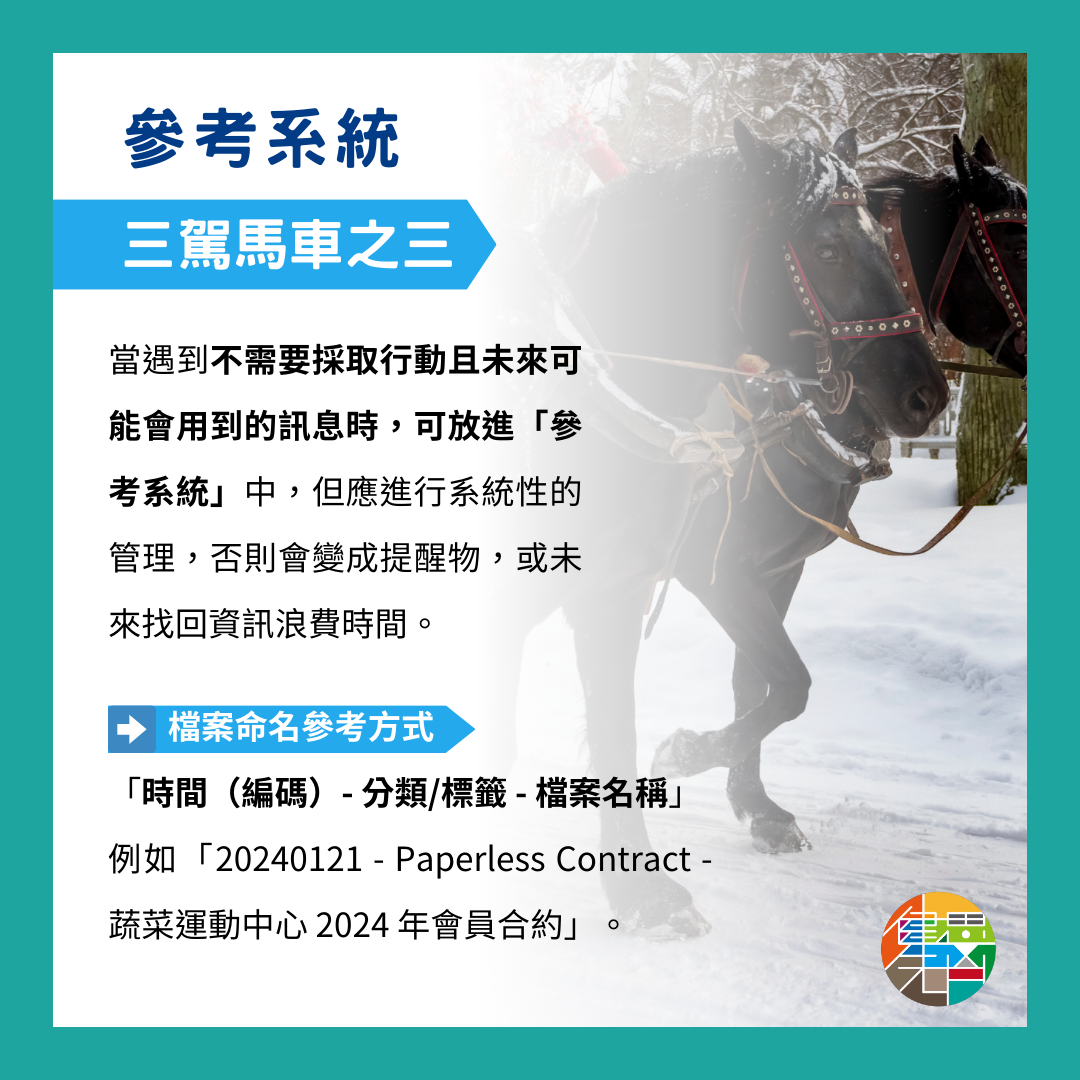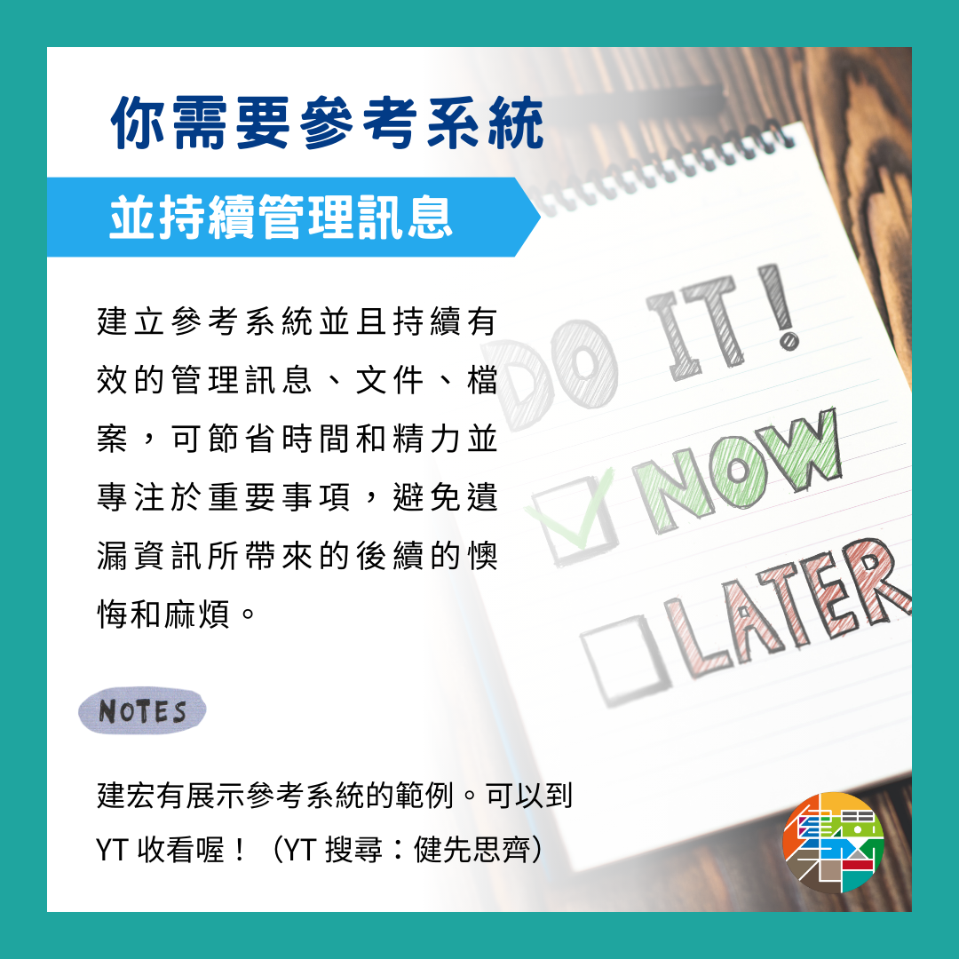 良好的參考系統管理可以幫助你有效地存儲不需立即處理的訊息,未來在尋找重要資訊時節省大量時間和精力,讓你可以將精力集中在真正重要的事情上,避免因遺漏資訊而造成的後續麻煩和遺憾。