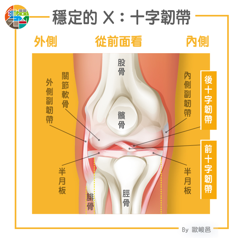 2 條十字韌帶位置非常靠近,由膝蓋前面向後看,這兩條韌帶會形成「X」型的形狀,因此,這樣 X 型的形狀有一個特殊的功能,限制小腿的旋轉,看到這邊你發現了嗎?十字韌帶限制了小腿往前、後移動,同時限制了小腿本身的旋轉動作,加上覆於其上的肌肉和膝蓋的結構,使得膝關節本身是一個非常穩定的結構。