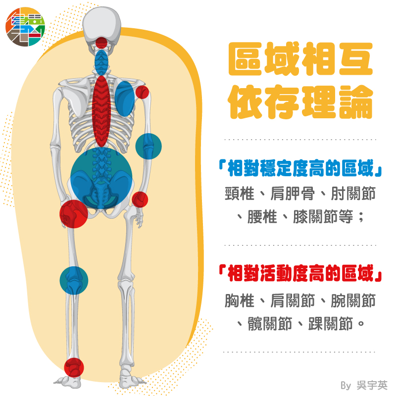 既然我們應該要有好的活動度,那是否讓身體每一個部位都很柔軟,一直拉筋拉到全身都鬆鬆的,這樣是不是就是最好呢?並不是這樣的喔!身體有些部位需要保持穩定,有些部位則需要活動度相對高一點。很多瑜伽體位法的練習強調要打開胸口、打開髖關節,但是像骨盆、肩胛骨等區域則應該要相對保持穩定,才能讓我們在穩定中做出好的活動,這就是所謂的「區域相互依存理論」。