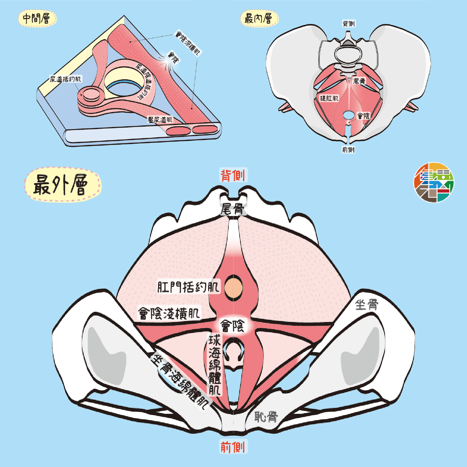 (圖 1:三層骨盆底肌圖,從最內層到最外層。Photo Credit: 健先思齊。)